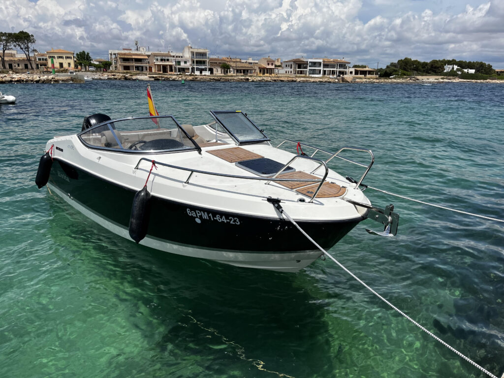 La embarcación Quicksilver Activ 595 Cruiser cuenta con un toldo de cerramiento completo proporciona protección ante la lluvia, mientras que el toldo bimini ofrece gran espacio de sombra ante los rayos del sol, lleva la bañera forrada en madera de teca real, toldo cerramiento completo, solarium de proa, mesa, camarote, escalera de baño, radio con bluetooth, conexión de 12v y mucho más. Perfecta para pasar un día genial en familia o con amigos.